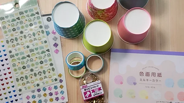 シールをはったり、マステをはったり…ペンなどでデザインしてもいいよ。
