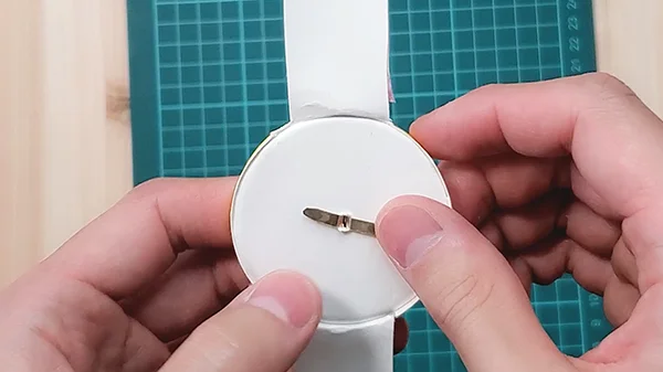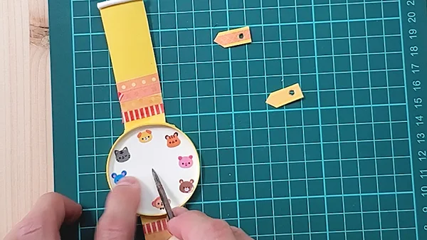 モールを通すために紙コップの底面、時間が書かれた腕時計の文字盤面に、穴をあけます。