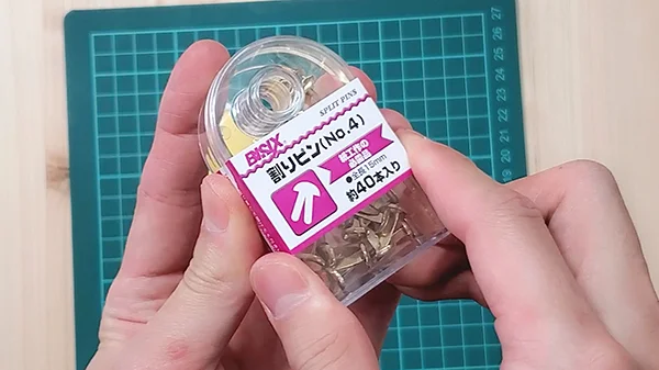 すると割りピンが裏から飛び出していますので、これを二つに割るように広げます。